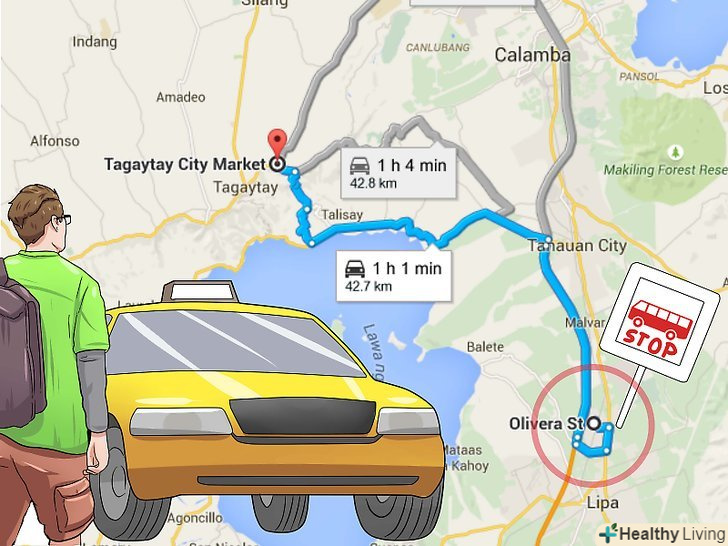 Рушайте в Олівера Плаза. у Тагайтаї немає автовокзалу. Всі автобуси зупиняються в Олівера Плаза. Тут ви зможете знайти таксі, яке відвезе вас в будь-яку точку міста. [8]