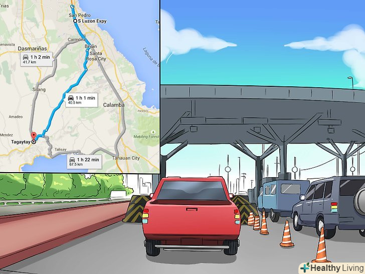 - Якщо ви вирішили їхати на машині, знайте, що потрапити в Тагайтай можна і іншим маршрутом. Ви можете їхати по прибережній дорозі через Імус, Дасмарінас і Сіланг Кавіте. Цей маршрут довше і більш завантажений іншим транспортом, але зате ви побачите більше мальовничих пейзажів. [31]
