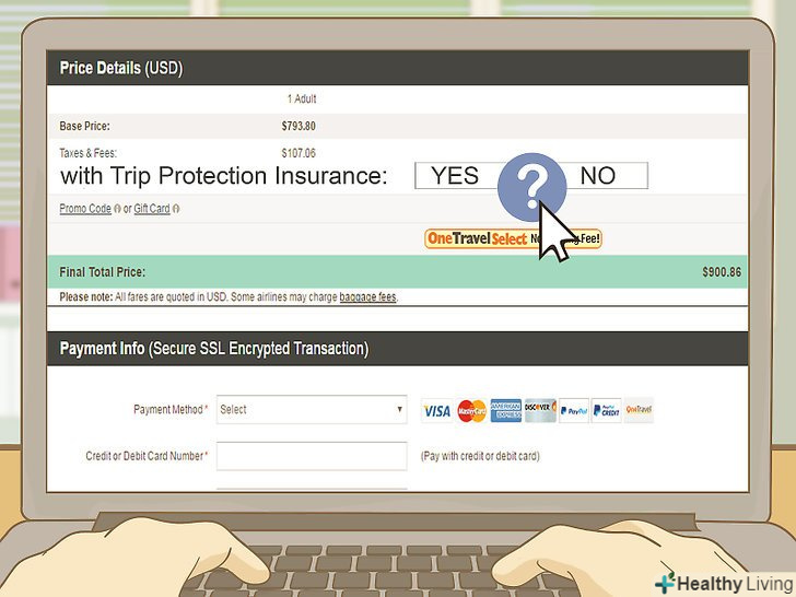 Визначтеся, додавати страховку чи ні. у процесі бронювання вам також може бути запропоновано додати страхове забезпечення. Прочитайте інформацію, зазначену дрібним шрифтом, і вирішите, чи потрібно вам страхування для вашого рейсу і поїздки.- Поліс обов'язкового медичного страхування є документом, що засвідчує право застрахованої особи на безкоштовне надання медичної допомоги на всій території Російської Федерації в обсязі, передбаченому Базовою програмою ОМС. Так що якщо ви їдете в інше місто Росії, турбуватися нема про що. [7] якщо ж їдете в іншу країну, розгляньте варіанти страхування і порівняйте ціни.