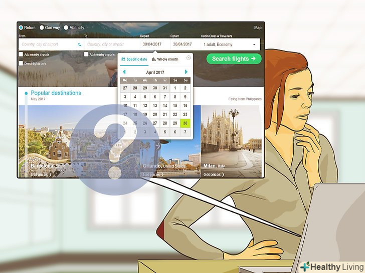 Введіть деталі поїздки на сайті-агрегаторі. відвідайте сайт-агрегатор (наприклад, SkyScanner, Momondo або Google Авіаквитки), який проводить пошук серед безлічі авіакомпаній, і введіть інформацію про поїздку. Веб-сайт видасть вам велику кількість варіантів польоту, виходячи із запитуваного пункту призначення і дат. І потім ви зможете відсортувати ці варіанти за цінами, авіакомпаніям або тривалості перельоту. [4]- Багато сайтів-агрегатори дозволяють вводити кілька напрямків і шукати рейси за кількома датами. Це допоможе вам знайти кращу пропозицію, якщо у вас гнучкі умови поїздки.