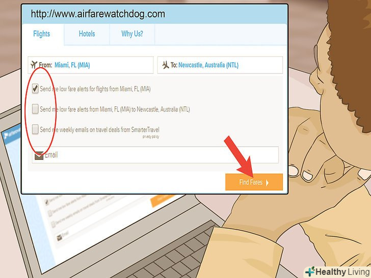 Перевірте сайти-пошуковики різних авіатарифів. перед бронюванням вивчіть сайти-пошуковики різних авіатарифів, наприклад, Aviasales, щоб перевірити наявність знижок. Це особливо корисно, якщо пункт призначення або дати поїздки — гнучкі, так як в цьому випадку ви зможете скористатися перевагами будь-якого варіанту.- Авіакомпанії іноді діляться знижками зі своїми клієнтами на власних веб-сайтах або за допомогою інформаційної розсилки. Підпишіться на розсилку новин від провідних авіакомпаній або відвідайте їх сайти для пошуку пропозицій.
