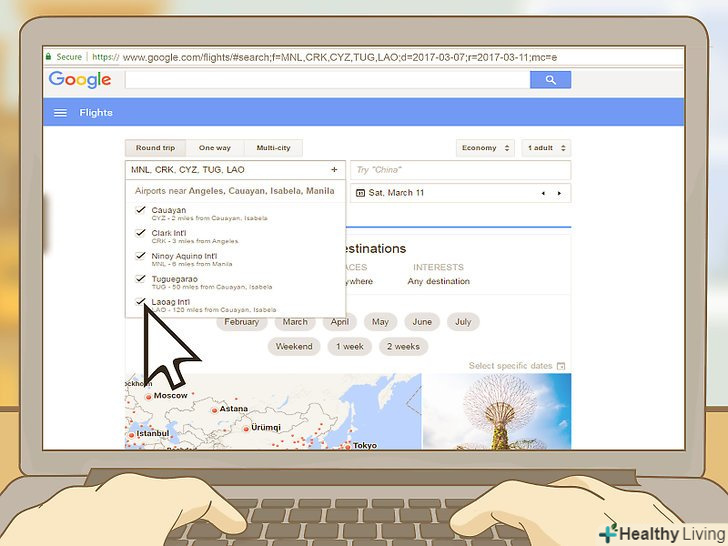 - Якщо ви прив'язані до конкретного місця призначення, ви все одно можете пошукати наявність прилеглих (або другорядних) аеропортів. Наприклад, якщо ви збираєтеся відвідати родичів в Сан-Франциско, Ви також можете подивитися рейси в розташований неподалік аеропорт Окленда. [8]