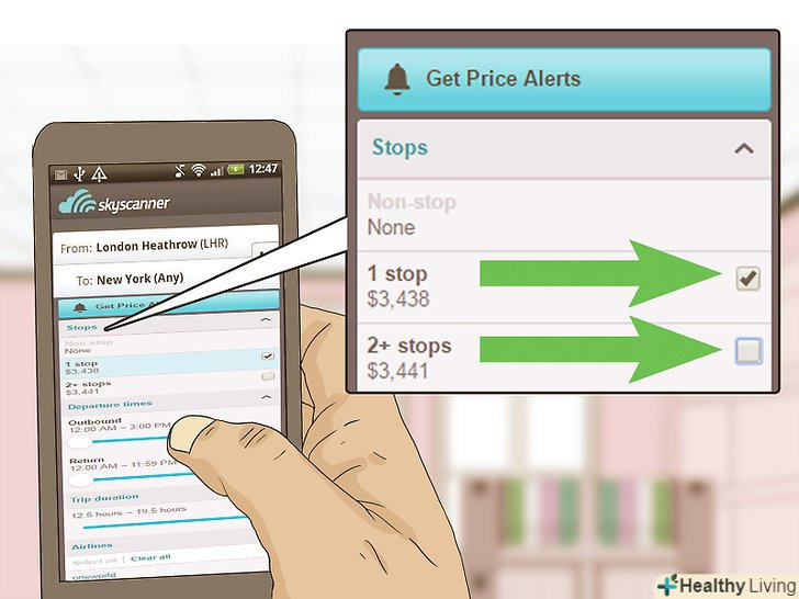 Виберіть, скільки зупинок/пересадок ви хочете зробити. Часто під час рейсу, особливо у віддалені місця, потрібно робити проміжні зупинки по шляху прямування. Іноді для цього необхідно змінити літак і знову пройти рамку огляду. При пошуку рейсів не забудьте взяти до уваги, яка кількість зупинок або пересадок буде для вас зручним. Також перевірте, як довго і в який час доби вони будуть проводитися.- Можливо, ви зможете знайти дешевший рейс, якщо не проти додати додаткову зупинку. Однак, важливо добре обміркувати, чи коштують довжина і час пересадки зекономлених грошей.