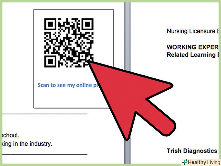 Додайте QR-код в резюме. найкраще помістити код відразу після основної інформації резюме (імені, бажаної посади і контактних даних). Додати і вставити QR-код в резюме ви можете в графічному або текстовому редакторі з підтримкою графіки.- Змініть розмір QR-коду, якщо потрібно.