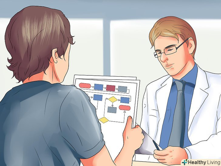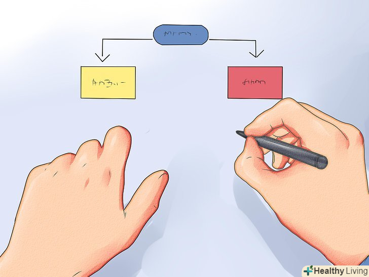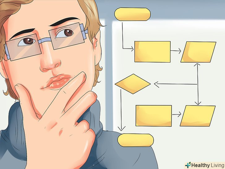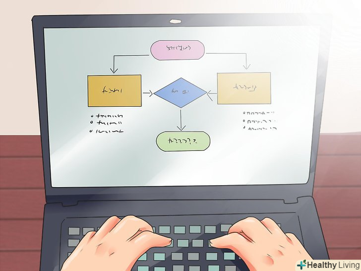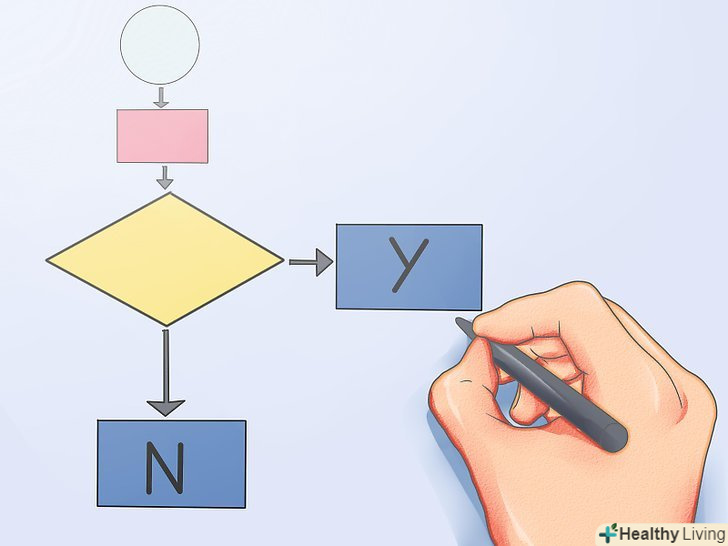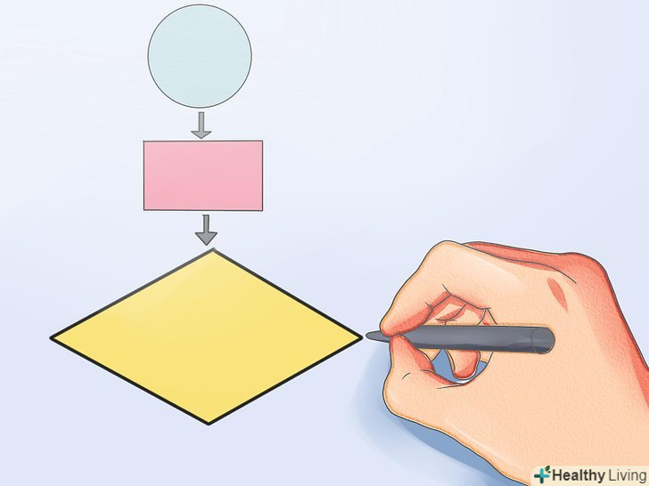 Будьте послідовні. використовуйте рамки приблизно однакового розміру і не більше двох-трьох легко помітних кольорів, щоб схему було якомога легше читати. Наприклад, у всіх рамок (завдань) може бути блакитний фон, а всі ромби (питання) можуть бути жовтого кольору.- Якщо можливо, зробіть так, щоб лінія відповіді "так" завжди починалася з одного боку рамки (наприклад, праворуч), а відповіді "ні" – завжди з іншого (наприклад, знизу). [5] це не завжди легко або можливо досягти, тому не витрачайте на це занадто багато часу.