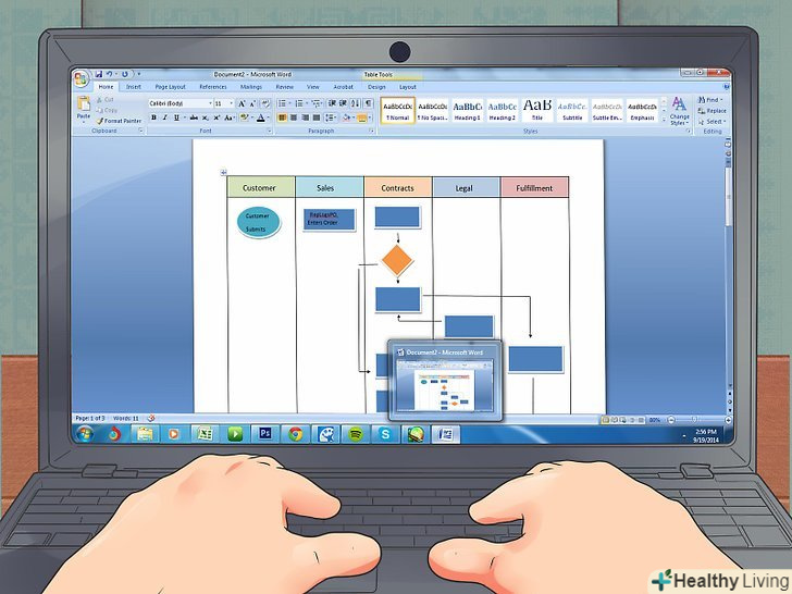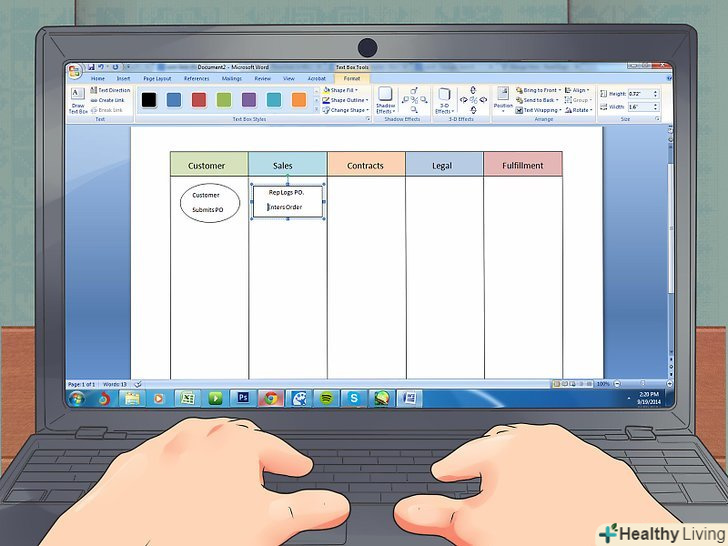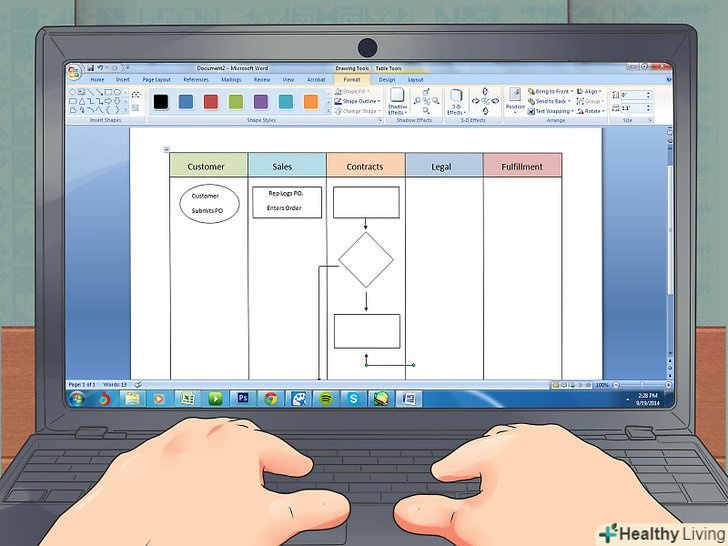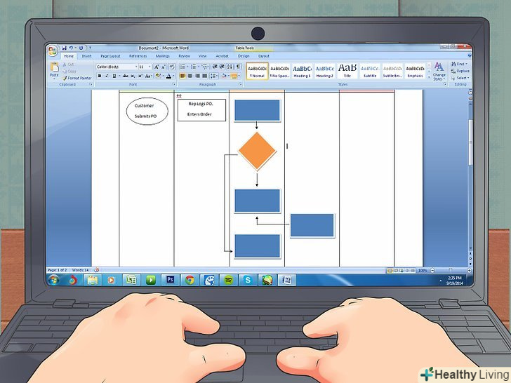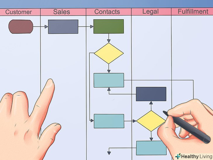 Використовуйте їх для складних процесів, які задіють кілька людей або відділів. якщо ви документуєте комплексний процес, в якому бере участь кілька людей, команд або відділів, які працюють окремо, розгляньте варіант складання складної структурної схеми. Описаний тут Тип структурної схеми називається "схема плавальних доріжок "або"схема Раммлера-Браша". [3] за схемою чітко видно, хто відповідає за кожне завдання, і легше визначити ділянки, де можна поліпшити процес.- Структурна схема повинна описувати, як процес відбувається зараз, а не як він повинен відбуватися.