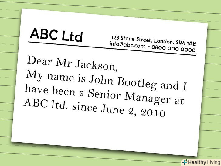 Поясніть, хто ви. після обов'язкового привітання слід повідомити одержувачу, хто ви, яку посаду займаєте в цій компанії і дату початку вашої роботи.- Як приклад можна навести наступне: "Мене звуть Іван Іванов. Я працюю старшим піратом в " Thieves Inc. "з 2 червня 2010 року".