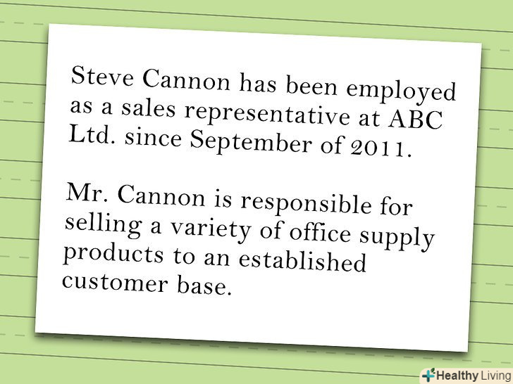 Розкажіть, як довго співробітник працює на фірмі. вкажіть ім'я службовця, дату початку його роботи, його посаду і чи є вона на постійній основі (в цьому першому параграфі).- Наприклад: "цей лист підтверджує зайнятість співробітника Петра Петров. Петро Петров займає посаду капітана в корпорації " Thieves, Inc."повний робочий день з 5 липня 2011 року".