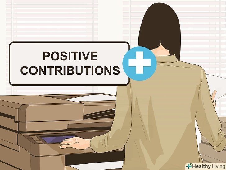 Відзначайте позитивний внесок, який ви вносите. Подумайте про хороші речі, які ви робите на роботі, навіть про дрібні. Якщо ви виконуєте нудне завдання по введенню даних в некомерційній організації, подумайте, як цей процес приносить користь організації в цілому. Навіть якщо ви крихітний гвинтик в механізмі, ви дозволяєте йому рухатися, і Вам слід пишатися цим. [5]- Навіть якщо ви не захоплені своєю роботою, можливо, ви привносите щось в колектив. Якщо ви добрі до своїх колег, швидше за все, ви сприяєте позитивній робочій атмосфері.