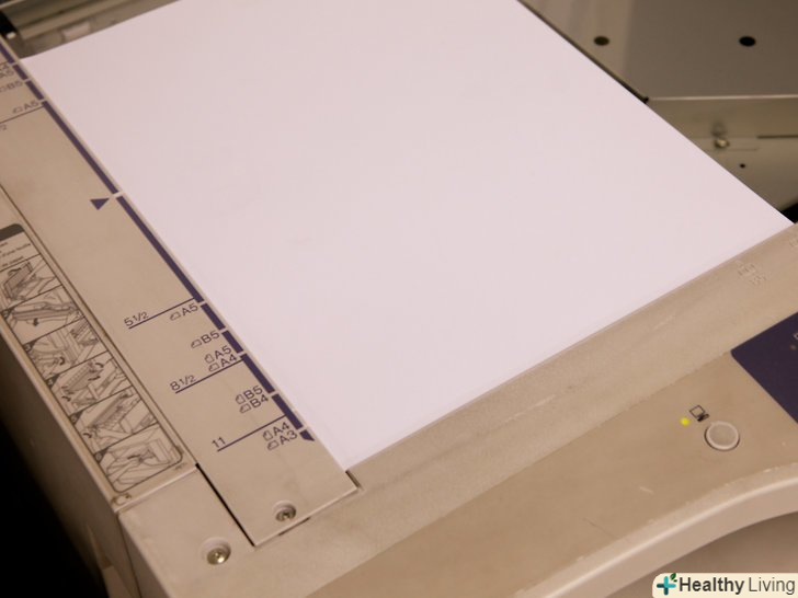 Вставте аркуш у подаючий лоток (зазвичай друкованою стороною вгору), або помістіть документ на скло (друкованою стороною вниз) поруч зі стрілкою. з боків там повинні бути розмітки з розмірами паперу. Відрегулюйте розмір лотка для паперу. Якщо об'єкт копіювання невеликий, можна покласти на нього чистий білий аркуш, щоб уникнути зайвої витрати чорнила, але на краях копії виходити сірі або чорні тіні.