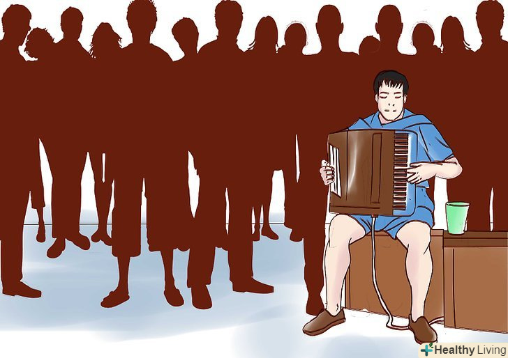 Придумайте хороший номер. щоб виступати на вулиці, не потрібно бути найкращим у своєму ремеслі. По суті, багато хто з тих, хто прикидаються жебраками (деякі-талановито, деякі - не дуже), теж займаються вуличним перформансом, щоб отримати трохи грошей. Виступи на вулиці-хороша можливість для вас або вашої трупи репетирувати ваш номер і набути досвіду виступу перед публікою. Але якщо ви серйозно налаштовані заробити грошей, ваше уявлення має бути створено і поставлено саме для показу на вулиці. Є два основних типи вуличних вистав.- Уявлення для перехожих являють собою безперервне дійство. Люди проходять повз артистів, несподівано хтось із них зупиняється або просто на ходу кидає гроші. Більшість музичних номерів розраховані на публіку, що проходить, і, оскільки в цьому є елемент випадковості, більшість перехожих не будуть стояти і слухати більше однієї-двох пісень. Але все ж слід звертати увагу на те, що ви граєте, коли підходять люди, і, якщо вони затримуються біля вас, уникайте повторення репертуару.