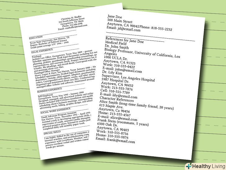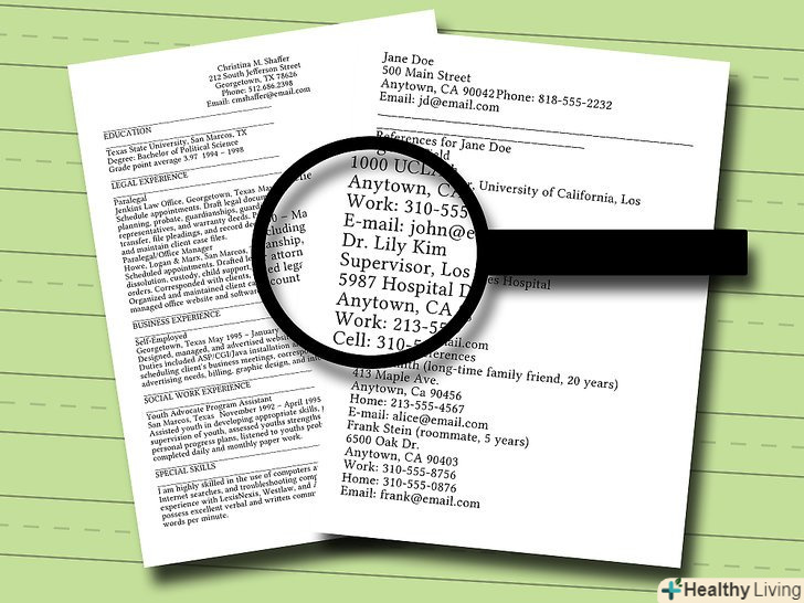 Приготуйтеся надати кілька особистих рекомендацій. більшість ваших рекомендацій носять професійний характер, але деякі роботодавці можуть запитувати і особисті рекомендації. Останні не повинні надаватися вашою сім'єю, але зобов'язані мати відношення до ваших родичів і друзів.- Віддавайте перевагу особистим рекомендаціям з високим рівнем професіоналізму. Лікарі, юристи, медсестри, вчителі та інші представники громадських професій надають більше рекомендацій. Можна вказувати ділові контакти, досвід волонтерської роботи та членство в організаціях.