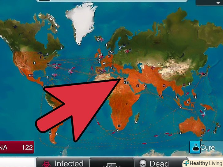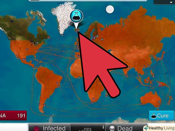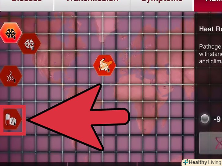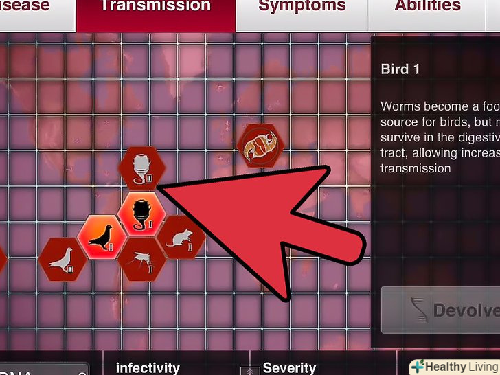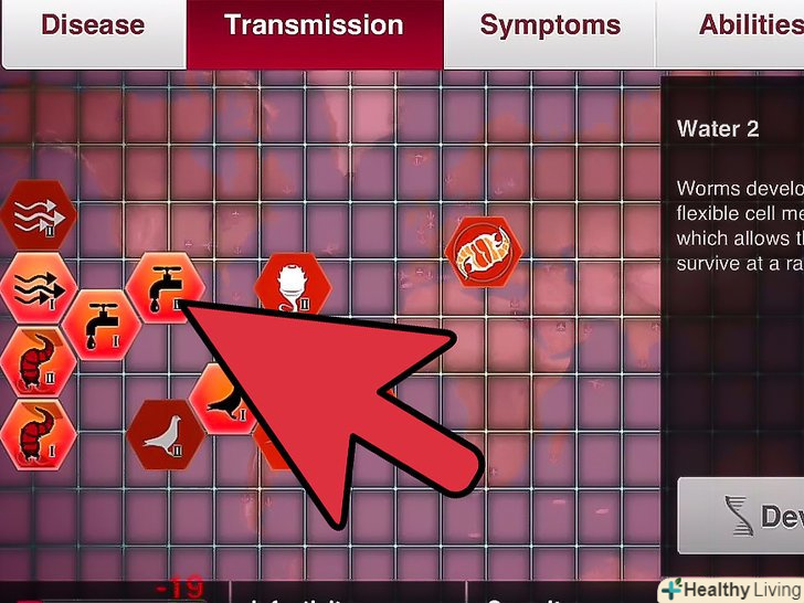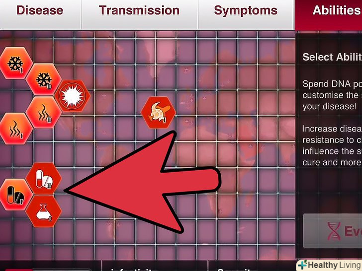 Вивчіть Air 2 і Water 2.поверніться назад в гру і починайте поширювати хворобу. Активуйте всі червоні бульбашки. Чим більше країн ви заразите, тим активніше піде процес пошуку ліків. Вивчіть Air 2 і Water 2, що відкриє вам доступ до Air 3 - його теж треба вивчити.- Якщо у вас і тепер є окуляри ДНК, поверніться на вкладку Abilities і купуйте drug Resistance 2, потім поверніться в гру і спостерігайте, як поширюється по країні Neurax Worm.