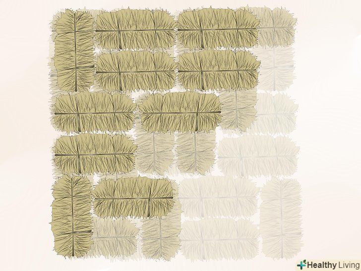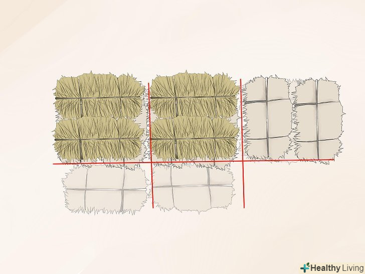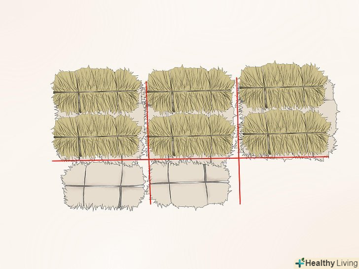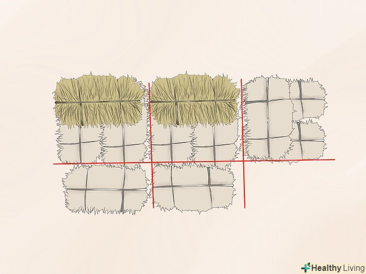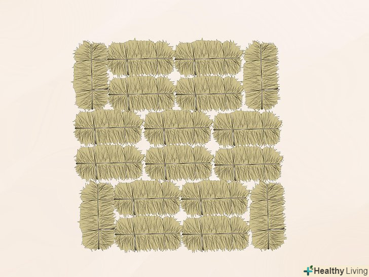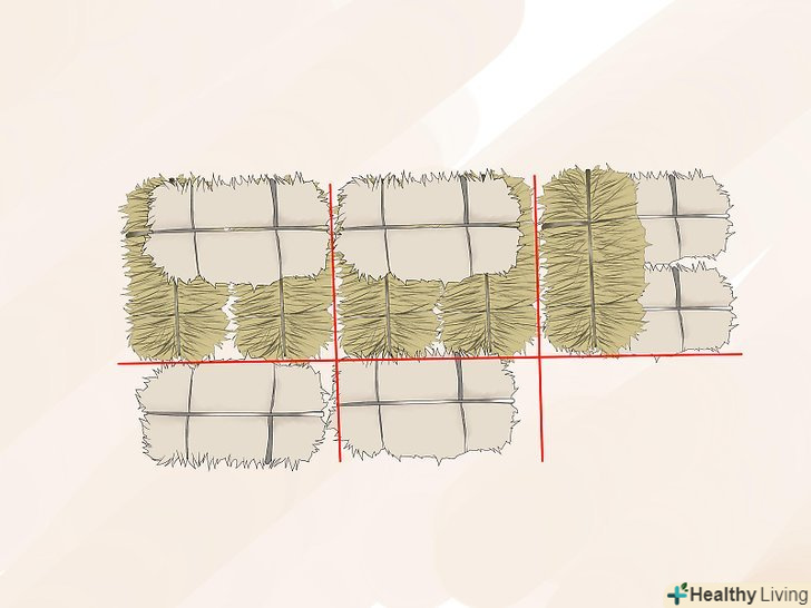 - Розкладіть тюки по всій площі першого ярусу, а потім накладайте їх, починаючи з кутів до середини. Кути скирти повинні бути обов'язково прямокутними: таким чином скирда збереже стійкість, коли стане високою (20 ярусів). [1]