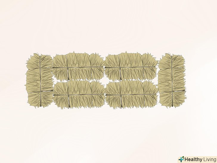 Скиньте тюки на підлогу або на солом'яне покриття і почніть укладати перший ярус скирти.- Складайте тюки боком вгору, так щоб мотузки були збоку, а не зверху чи знизу. Стебла сіна повинні лягати вертикально і якщо тюк був сформований правильно, його верх буде колючим і шорстким. Щоб легше запам'ятати, кладіть тюки "гладкою стороною вгору".