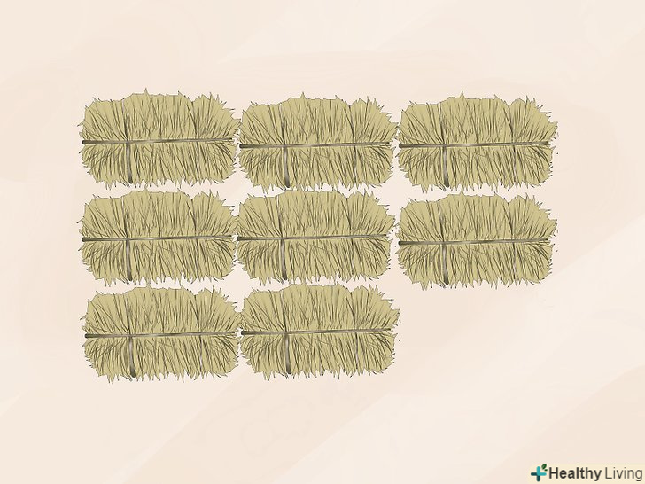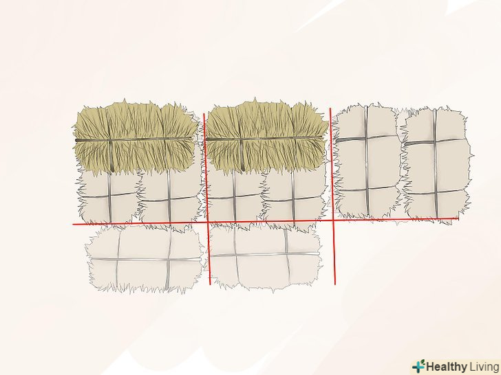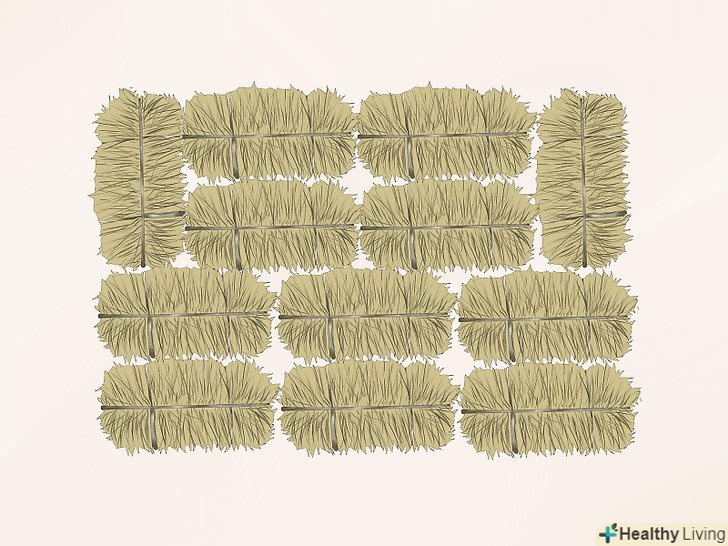 - Тюки укладають на бік, тому що так швидше висихає волога, і вони стають більш стійкими до вогню, цвілі і грибка. Недолік цього методу полягає в тому, що скирда може вийти не такою стійкою, якщо звичайно не використовувати більш надійну техніку укладання. Як варіант, ви можете поставити тюки нижнього ярусу вертикально, а інші укласти мотузками вгору (на широку сторону). [1]