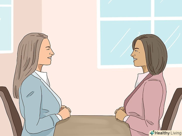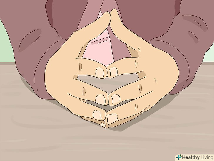 Підтримуйте зоровий контакт. зоровий контакт — безвідмовна можливість справити впевнене враження в процесі розмови. Якщо вам складно дивитися людям в очі, то можна заздалегідь потренуватися з другом або родичем. [5]- Зоровий контакт дуже важливий, але не потрібно пильно вдивлятися в співрозмовника. Іноді опускайте очі на стіл, щоб відвести погляд.
