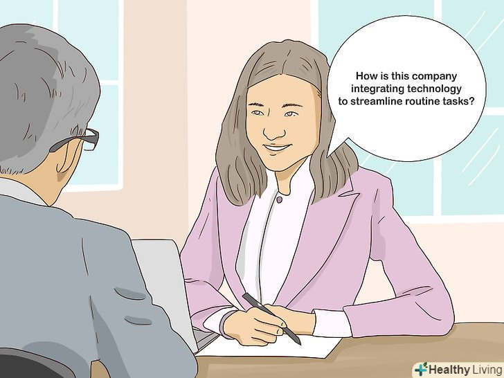 Задавайте розумні питання. в кінці співбесіди у вас напевно поцікавляться, чи бажаєте ви задати питання. Такі питання слід підготувати заздалегідь. Необов'язково задавати всі свої питання тільки в самому кінці. [12]- Наприклад, запитайте: «які методи використовуються в компанії для спрощення типових завдань?»