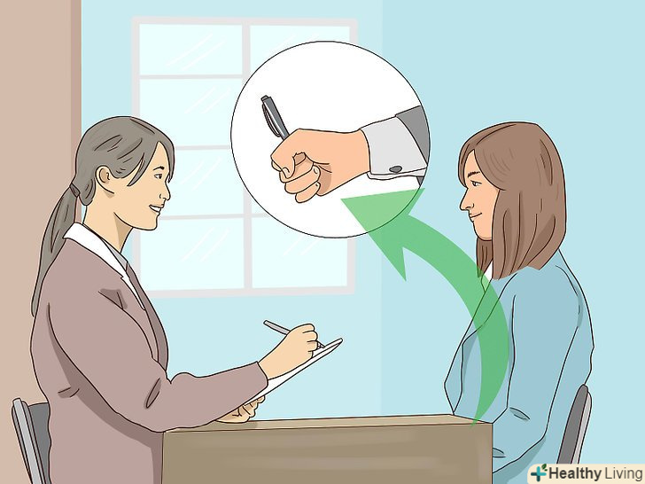 Не метушіться. метушливість-природний результат хвилювання, кожен працівник відділу кадрів про це знає. Намагайтеся сидіти якомога спокійніше. Візьміть в руки який-небудь предмет, щоб не чіпати волосся і не барабанити пальцями по нозі або крісла. [18]- Якщо вам складно контролювати свої ноги, то не відривайте ступні від підлоги або покладіть собі на коліна папку з документами. У моменти мовчання тримайте руки на колінах.