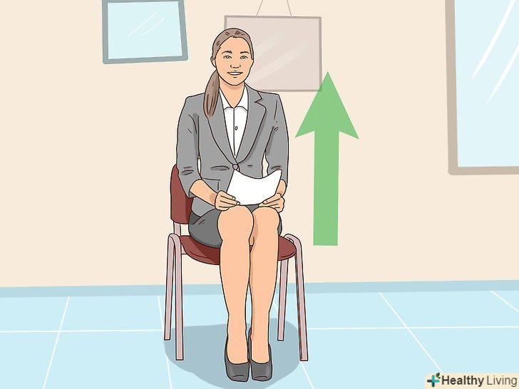 Сидіть рівно. хороша постава не тільки виражає впевненість і хорошу самооцінку, але також покаже вас здоровою і стриманою людиною. Навчіться сидіти на передній половині стільця і торкатися ступнями підлоги. [6]- Підніміть підборіддя і розправте плечі, щоб лопатки розташовувалися уздовж хребта. Ваша спина повинна бути прямою і рівною, а не зігнутою в будь-яку сторону.