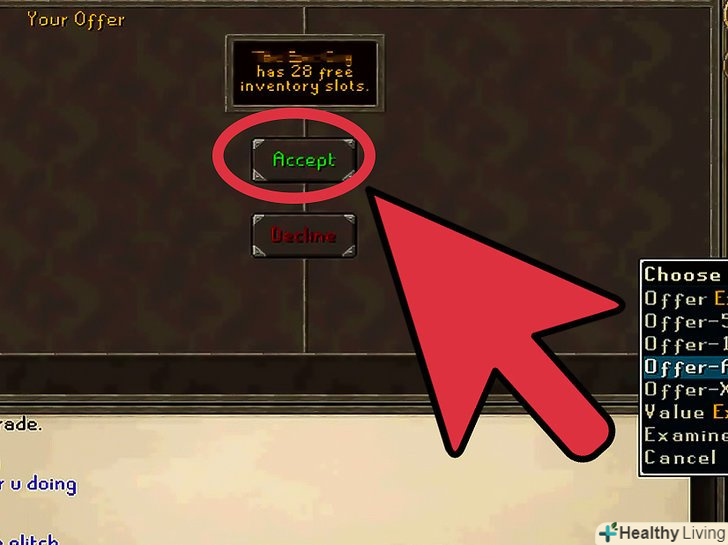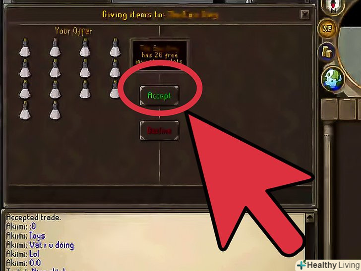 - Обмін предметів між Runescape 3 і старими версіями Runescape не представляється можливим. Вони є абсолютно різними світами без будь-якої можливості взаємодії. Якщо ви довіряєте іншому гравцеві, можете укласти з ним угоду.[7] Дайте їм предмет в одній грі і сподівайтеся, що Він стримає слово і зробить обмін в іншій грі.
