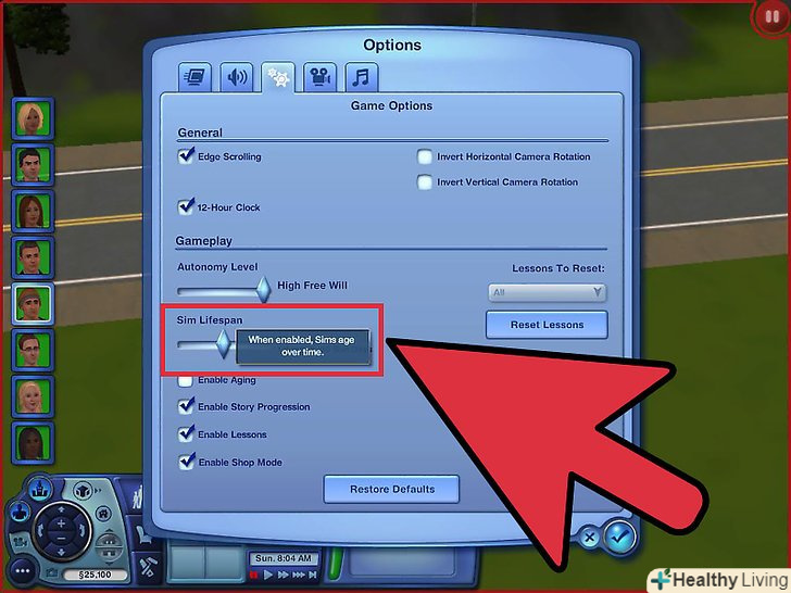 Задайте за допомогою налаштувань установку, що ваші Сіми люблять жити довго.це можна зробити, відключивши можливість старіння в грі, або ж встановивши максимально можливі вікові рамки.