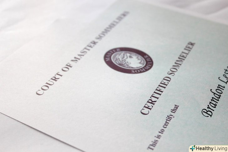 Отримайте сертифікат.- За законом сомельє не потрібна сертифікація, і ви можете отримати роботу в ресторані середнього класу або приватному клубі на підставі досвіду, самонавчання і просто гарного смаку. Тим не менш, якщо ви станете сертифікованим сомельє, це збільшить ваші шанси на роботу в ресторані більш високого рівня, тим самим збільшуючи вашу рентабельність і повагу в світі вина.