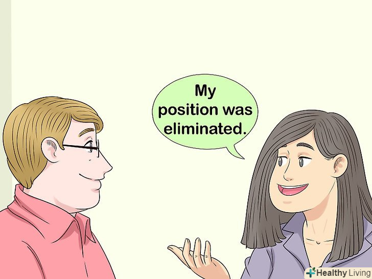 Не соромтеся скорочення. скорочення штату-щось інше, ніж звільнення. Воно не стільки пов'язано з вашою продуктивністю, скільки з рентабельністю самої компанії, і людина, яка проводить з вами співбесіду, знає про це. Якщо вас скоротили, постарайтеся не надто турбуватися про те, що про це подумають. [9]- Якщо ви потрапили під скорочення, підкресліть це, сказавши, що ваша посада була скорочена або що компанія розпустила працівників через фінансові проблеми.