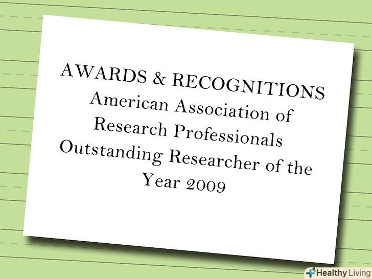 Розкажіть про ваші нагороди та досягнення. Якщо ви були удостоєні спеціального призу або визнання, згадайте про це в резюме, вказавши назву, дату і мета нагороди. Часто тут пишуть про присутність в "списку кращих студентів" за високий середній бал в університеті. Згадайте якомога більше нагород, щоб справити враження успішної і працьовитої людини.- Якщо у вас була робота, удостоєна особливих почестей, згадайте про це в резюме.