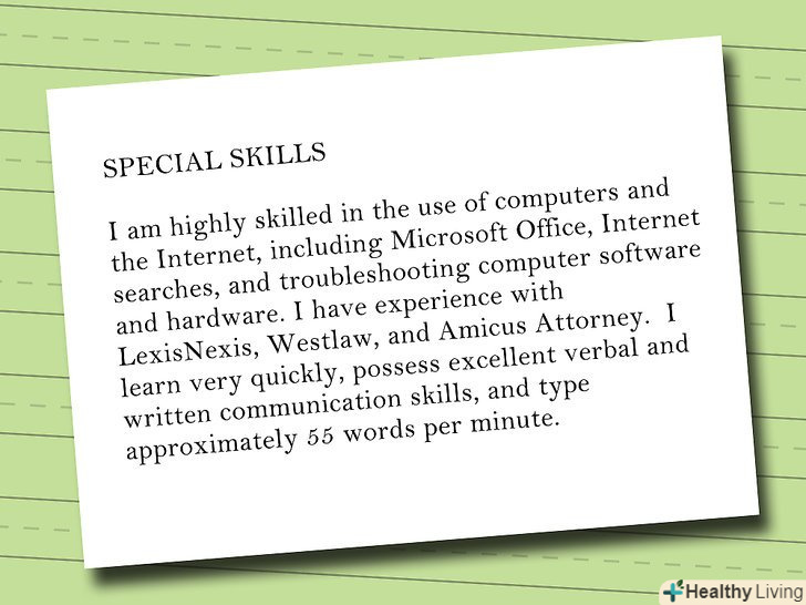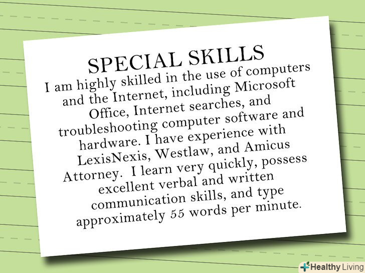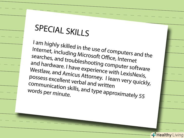 Напишіть про свої особливі знання та навички. після того, як ви виклали основну інформацію – вказали досвід роботи і освіту – ви можете додати все те важливе, що вважаєте за потрібне. Створіть розділ "особливі навички" або "виняткові знання", де і викладіть цю інформацію.- Якщо ви знаєте кілька мов, перерахуйте їх. Переконайтеся, що не забули вказати рівень володіння – наприклад, початковий, середній, просунутий, побіжний і тд.