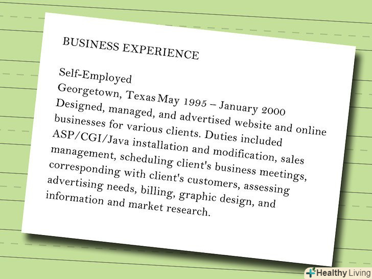 - Для кожного місця роботи включіть в список найменування Компанії, місце розташування, вашу посаду, опис ваших обов'язків, період роботи.
