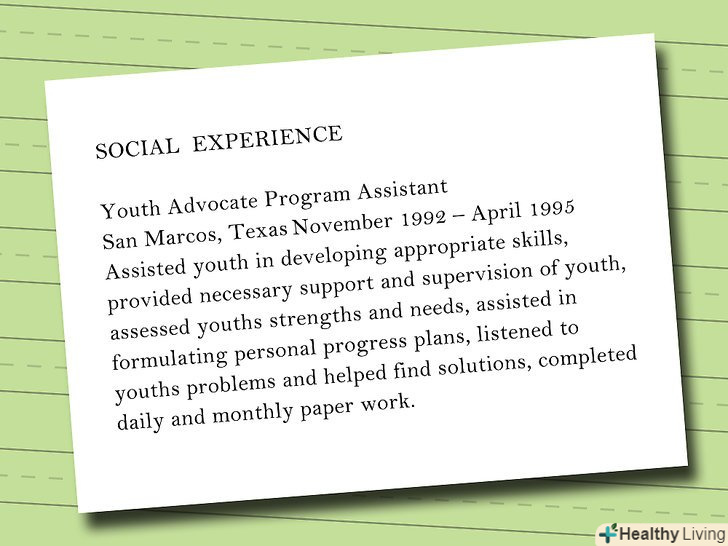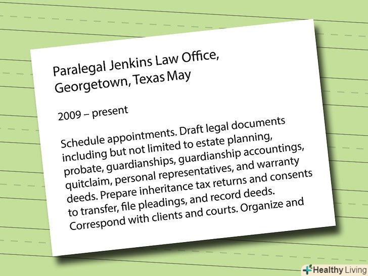 Складіть свій послужний список. Так як це не сама виграшна частина вашого резюме, розташуйте його в кінці резюме, для того, щоб фахівець з набору персоналу спочатку прочитав про Ваші більш значні досягнення.- Вам слід включити підзаголовки для кожного типу досвіду, який ви отримали, працюючи, наприклад," фінансовий досвід", "управлінський досвід", "юридичний досвід".