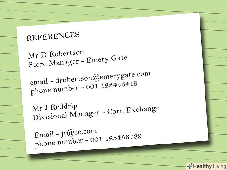 Надайте свої рекомендації. вам знадобляться 2-4 професійних рекомендаційних листи (від людей які не є членами вашої родини або друзями), де вказані ім'я особи, що дає рекомендацію, як він пов'язаний з вами, його контактну інформацію: номер телефону, адреса, електронна адреса.- Найкращими рекомендаціями можуть бути листи від керуючого або вашого начальника або, можливо, професора з коледжу, на чиїх заняттях ви відзначилися.
