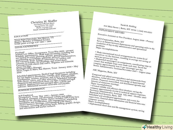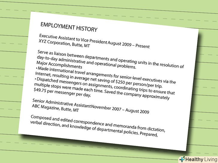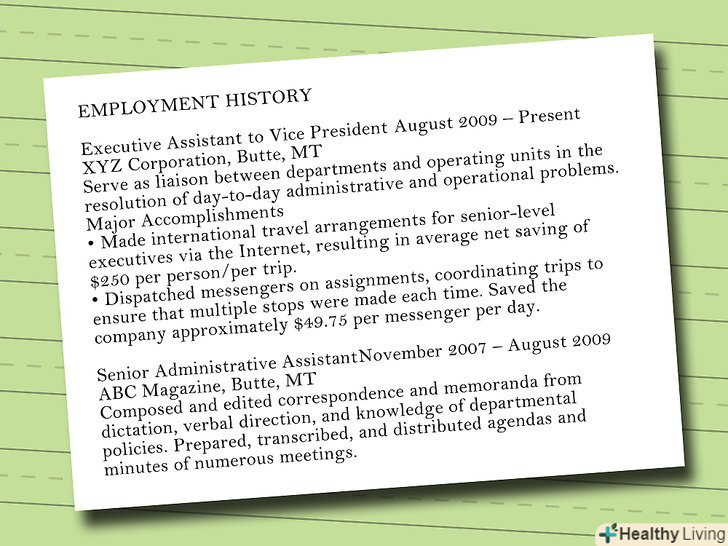 Складіть свій послужний список. це можна зробити двома способами. Якщо ваш послужний список включає в себе посади більш ніж однієї сфері, Вам слід зробити інформативні підзаголовки, які будуть класифікувати ваші обов'язки і навички, необхідні від вас на кожній посаді. Якщо ви хочете показати, як Ваші професійні навички розвивалися в міру кар'єрного росту, можете перерахувати місця роботи в зворотному хронологічному порядку, без будь-яких підзаголовків.- Переконайтеся, що надали загальну інформацію про кожного роботодавця / посади, включаючи назву компанії, місце розташування, вашу посаду, коло обов'язків і дати роботи.
