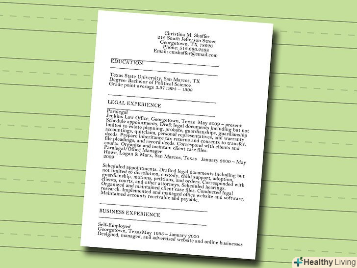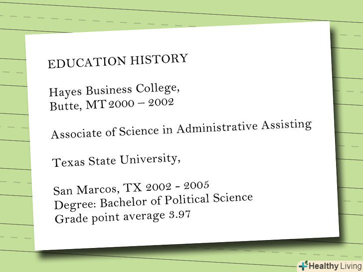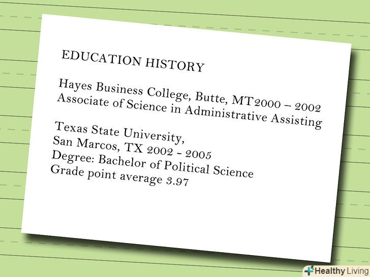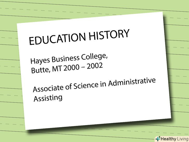 Надайте інформацію про вашу освіту. дані про вашу освіту будуть такими ж, як і в резюме інших стилів, різниця лише в тому, де розмістити цю інформацію. Для кожного коледжу, Університету, або професійного училища вкажіть найменування і місце знаходження, диплом або сертифікат про закінчення і час навчання.- Якщо ваш середній бал більше 3,5, вкажіть це.