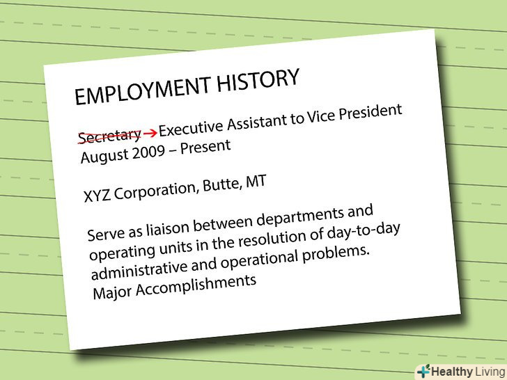 Використовуйте дієслова дії, щоб розповісти про свої обов'язки та досягнення. це підкреслить ваші навички і вашу здатність справлятися з роботою, на яку Ви претендуєте. Виберіть дієслова, які описують ваші зони відповідальності, потім стежте за тим, щоб використовувати ті ж дієслова на початку речень, що описують ваші посадові обов'язки. Наприклад, якщо ви працювали секретарем в приймальні, можна використовувати такі дієслова, як 'планувати', 'допомагати', 'забезпечувати'. Ви можете сказати, що 'планували зустрічі',' допомагали клієнтам 'і'забезпечували адміністративно-господарські потреби'.