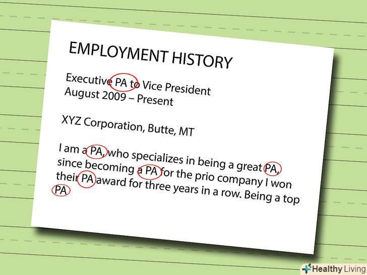 Стратегічно грамотно використовуйте ключові слова. Так як багато роботодавців сканують резюме за допомогою спеціальних програм, потім розпізнають їх на наявність певних ключових слів, і вибирають серед тих резюме, які містять ці слова, перш ніж ці резюме побачить певна людина. Переконайтеся, що ваше резюме містить вірні для вашої галузі та даної посади ключові слова.- Зверніть увагу на слова, які використовуються в описі вакансії. Якщо в оголошення вказані вимоги до наявності дослідницького досвіду, то ваше резюме повинно містити слова" дослідження"," досліджував " принаймні, в одному з описів ваших попередніх робіт.
