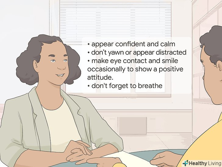Слідкуйте за своєю мовою тіла. більшість співбесід проходить з використанням усного спілкування, але частина інформації завжди передається невербально за допомогою мови тіла. Будьте уважні, щоб справити хороше враження. [4]- Тримайтеся впевнено і спокійно.