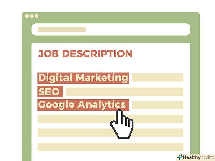 Підкресліть ключові слова. зверніть увагу, на яких словах акцентується увага. Наприклад, маркетингова вакансія може включати терміни на кшталт» цифровий маркетинг«,» SEO «і»Google Аналітика". Не забудьте згадати такі терміни у своєму резюме та мотиваційному листі. [2]