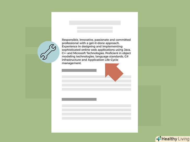 Адаптуйте резюмеВідповідно до опису посадових функцій. Резюме-це перелік ваших навичок і здібностей. Не менш важливо показати потенційному роботодавцю, що ваші навички відповідають потребам компанії. Змініть резюме під кожну вакансію, яка Вас зацікавила. Помічайте ключові слова і теми в посадовому описі, щоб відобразити їх в резюме. [6]- Наприклад, якщо у вакансії вказані «першокласні комунікативні здібності», тоді вам слід навести конкретні приклади використання таких навичок у минулому.