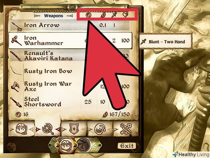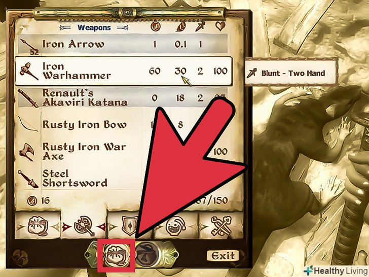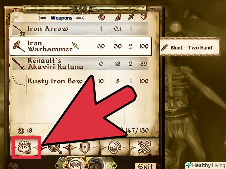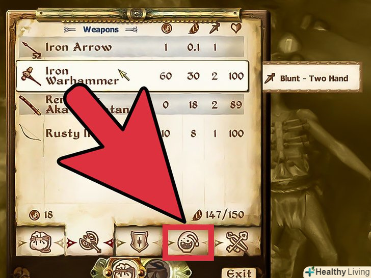 Відкрийте інвентар.щоб отримати доступ до своїх предметів, відкрийте "Журнал«, а потім перейдіть на вкладку»інвентар".[1]- ПК — натисніть клавішу Tab↹, щоб відкрити «Журнал», а потім натисніть на іконку кулака біля смужок здоров'я, магії і витривалості.