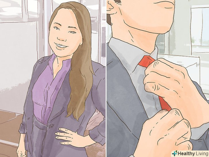 ОдягайтесяВ діловому стилі. перше враження відіграє важливу роль, тому слід виглядати на всі сто. Зазвичай рекомендується вибирати трохи більш суворий наряд, ніж робочий одяг в компанії. Якщо співробітники працюють в шортах і футболках, надіньте сорочку і штани. Одягніть блузку, піджак і спідницю-олівець, якщо дрес-код має на увазі повсякденний діловий стиль. [17]