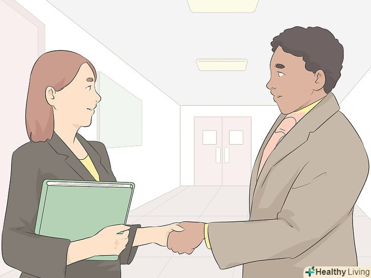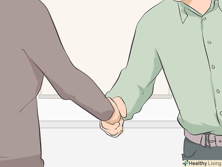 Продемонструйте свою впевненість через тверде рукостискання. при зустрічі з рекрутером ініціюйте рукостискання. Міцно стисніть руку людини і двічі її струсіть, перш ніж розривати рукостискання. Так ви покажете свою впевненість і хороші навички міжособистісного спілкування. [14]- Якщо у вас потіють долоні, непомітно витріть руку об одяг або серветку, перш ніж протягувати її для рукостискання.