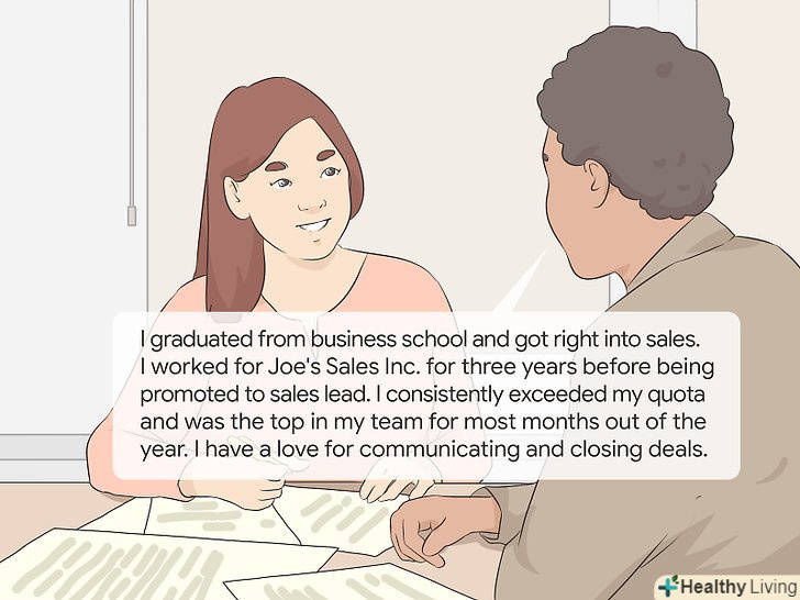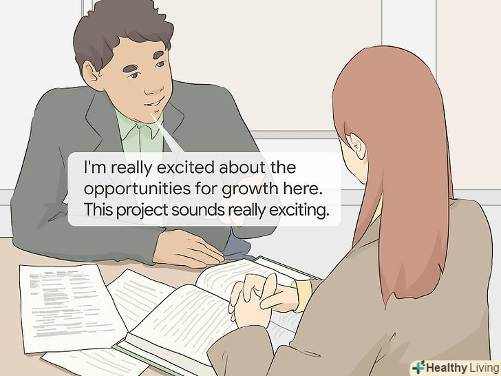На співбесіді самі задавайте позитивний і енергійний тон спілкування. ви будете більш серйозним кандидатом, якщо продемонструєте хороше ставлення і покажете свій натхнений настрій на роботу. Сконцентруйтеся на описі власних досягнень і надій на подальші успіхи. При обговоренні минулих складнощів поясніть, як вони допомогли вам вирости і які уроки ви з них витягли. [15]- Наприклад, повідомте рекрутера про те, як ви жадаєте приступити до виконання нових завдань. Скажіть: "мене захоплюють можливості кар'єрного зростання у вашій компанії. А перспектива участі в майбутньому проекті здається просто приголомшливою".
