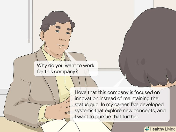 Поясніть, чому ви відмінно підходите для обговорюваної посади і самої компанії. Рекрутер захоче дізнатися, як ви будете вирішувати проблеми його компанії, тому поясніть, чому саме ви добре впораєтеся з посадовими обов'язками, якщо вас наймуть. Розкажіть, як Ваші навички підходять під вимоги до претендента вакансії, а також опишіть перші кроки, які ви зробите в разі найму. Додатково наведіть приклади минулого досвіду, які підтвердять, що ви добре впораєтеся з роботою і в цій компанії. [16]- Ваші відповіді на кожне питання повинні будуватися навколо того, як наявні у вас знання, навички та освіту підходять для вакантної посади і компанії в цілому.