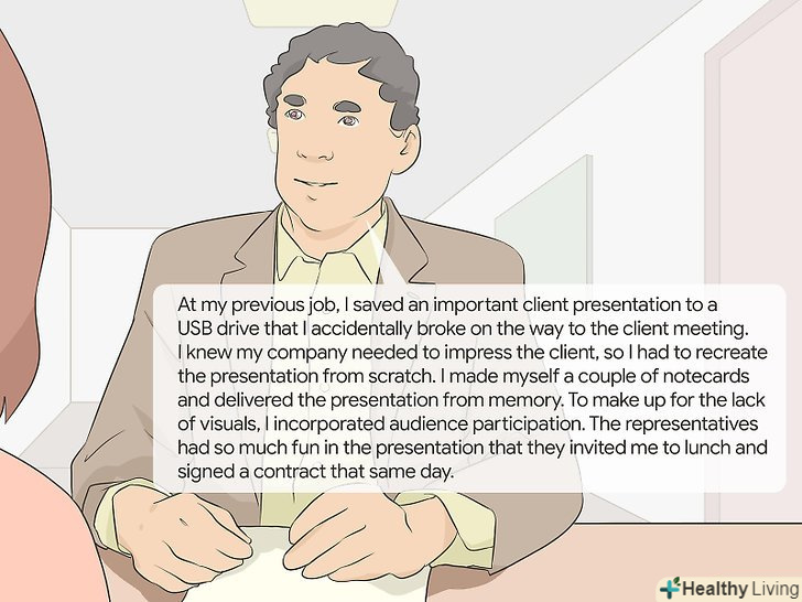 Розкажіть щось унікальне про свою кар'єру або про освіту, щоб вас запам'ятали. цілком ймовірно, що в компанії проводять співбесіди з великим числом потенційних кандидатів на посаду, тому ви легко можете загубитися в загальній масі. Щоб виділитися, розкажіть щось таке, що дозволить вас запам'ятати. Спочатку згадайте випадок з роботи або навчання, який відрізняє вас від інших претендентів посади, а потім включіть розповідь про нього в один зі своїх відповідей на співбесіді. [17]- Наприклад, припустимо, що вас запитали: «які помилки ви робили в минулому? Що саме тоді сталося?"На це можна відповісти так: «на моїй минулій роботі я зберіг важливу презентацію для клієнта на USB-накопичувачі, який випадково зламався по дорозі на зустріч з клієнтом. Я знав, що моя компанія повинна вразити клієнта, тому мені довелося відтворити презентацію з нуля. Я самостійно підготував кілька слайдів, а решту інформації відтворив по пам'яті. Щоб заповнити нестачу візуального матеріалу, я включив в презентацію активне спілкування зі слухачами. Представникам компанії моя презентація здалася настільки цікавою, що вони запросили мене на обід і підписали з нами контракт в той же день».