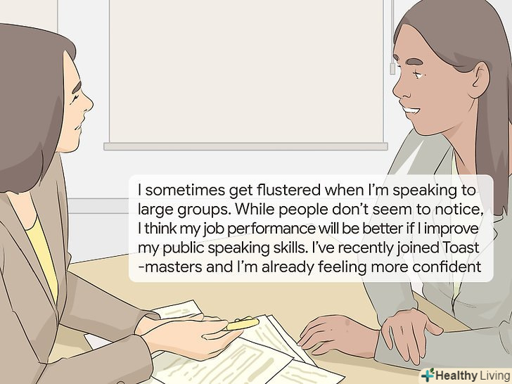 - Можна сказати: «я іноді гублюся, коли мені доводиться говорити перед великою аудиторією. З боку це, начебто, непомітно, але мені здається, що я міг би показати себе краще, якби розвинув свої ораторські навички. Нещодавно я вступив у Toastmasters і вже став більш впевненим у собі".
