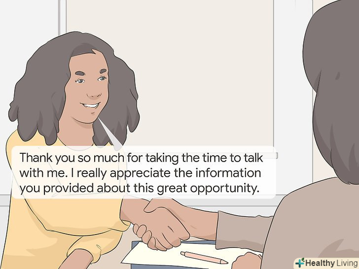 Подякуйте рекрутеру за витрачений час і надану допомогу. Рекрутер, ймовірно, дуже зайнятий своєю роботою, тому він оцінить вашу обізнаність про цінність його часу. Потисніть рекрутеру руку і скажіть, що ви вдячні за наданий шанс пройти співбесіду. Додатково скажіть спасибі за особливу допомогу, будь то у вигляді розповіді про компанію, пояснення розташування парковки або призначення співбесіди на відповідний вам час. [23]- Скажіть: «Велике спасибі за витрачений час. Я ціную надану Вами інформацію про приголомшливу можливість працювати в компанії".