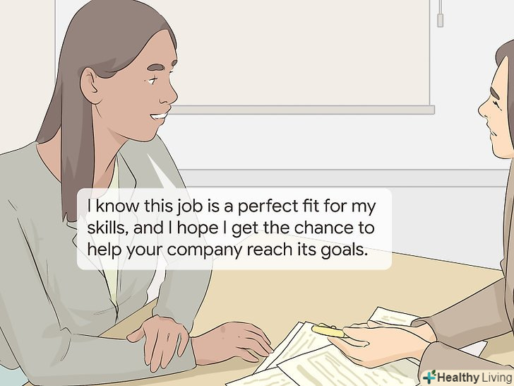 Дайте рекрутеру зрозуміти, що ви дійсно хочете отримати роботу. Люди нерідко змінюють свої наміри після проходження співбесіди. З цієї причини рекрутер, ймовірно, зверне більше уваги на тих кандидатів, які здадуться йому більш налаштованими на отримання посади. Перш ніж піти, дайте рекрутеру зрозуміти, що вам потрібна ця робота, прямо сказавши йому про це. [24]- Можна сказати: «я знаю, що дана робота ідеально підходить для наявних у мене навичок, сподіваюся, у мене буде шанс допомогти вашій компанії досягти своїх цілей».