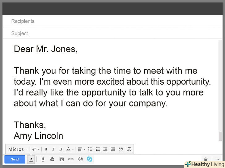 Після співбесіди надішліть рекрутеру по електронній пошті лист-відгук або повідомлення з вдячністю. деякі рекрутери сприймають наступний лист від здобувача як індикатор його реальної зацікавленості. Для більшості вакантних позицій після співбесіди розумно буде відправити по електронній пошті коротке повідомлення про те, що ви цінуєте надану вам можливість і доступні для подальшого обговорення роботи. Однак якщо ви зайняті в творчій індустрії або будь-якої некомерційної діяльності, іноді буває корисно направити на адресу рекрутера рукописний лист. [25]- Напишіть наступне: «шановний Вікторе Петровичу, велике спасибі за витрачений на зустріч зі мною час. Я дуже радий представилася сьогодні можливості поспілкуватися і будуть готовий обговорити з вами більш детально, що ще я можу зробити для вашої компанії. З повагою, Сергій Петров"»